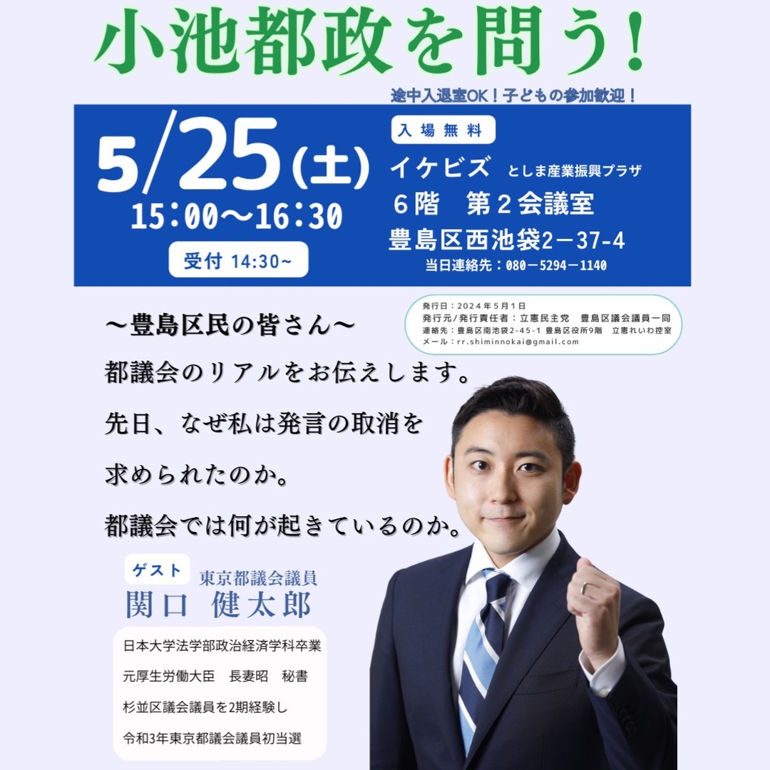 ゲストに東京都議会議員 関口健太郎氏をお招きし、都政報告会を行いました。