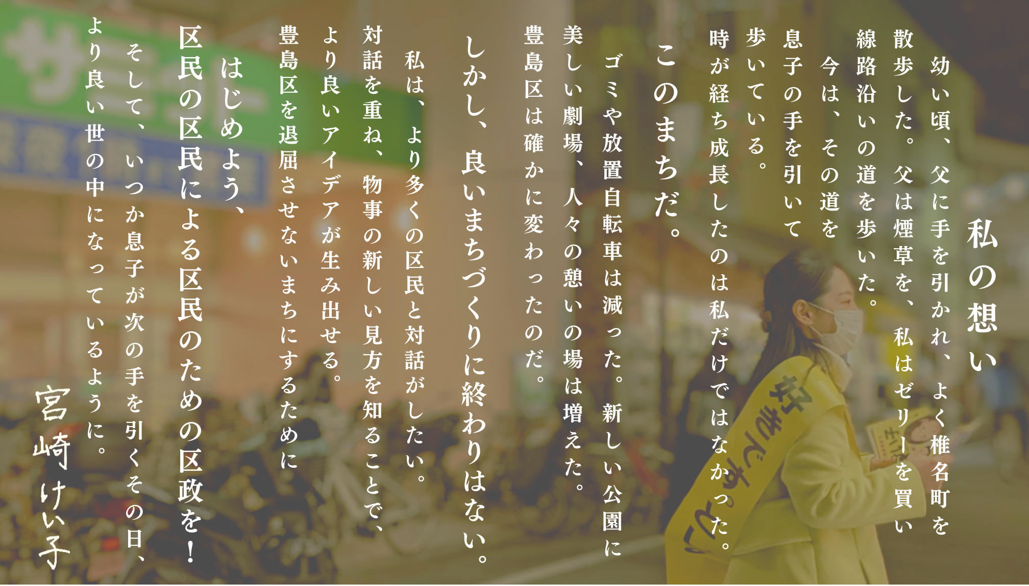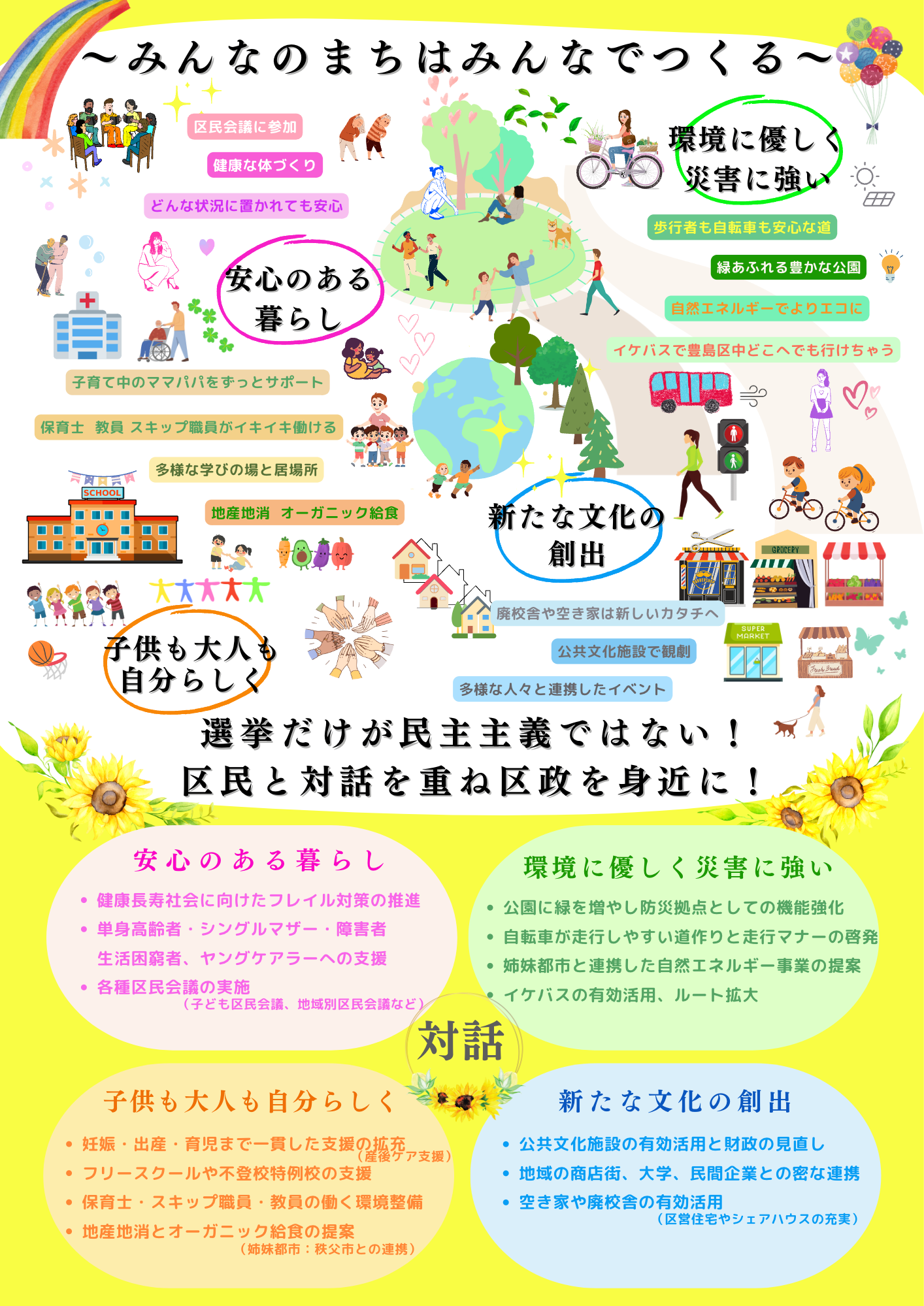 私が目指す豊島区政とは、区民と共につくり上げる区民の区民による区民のためのまちづくりです。
